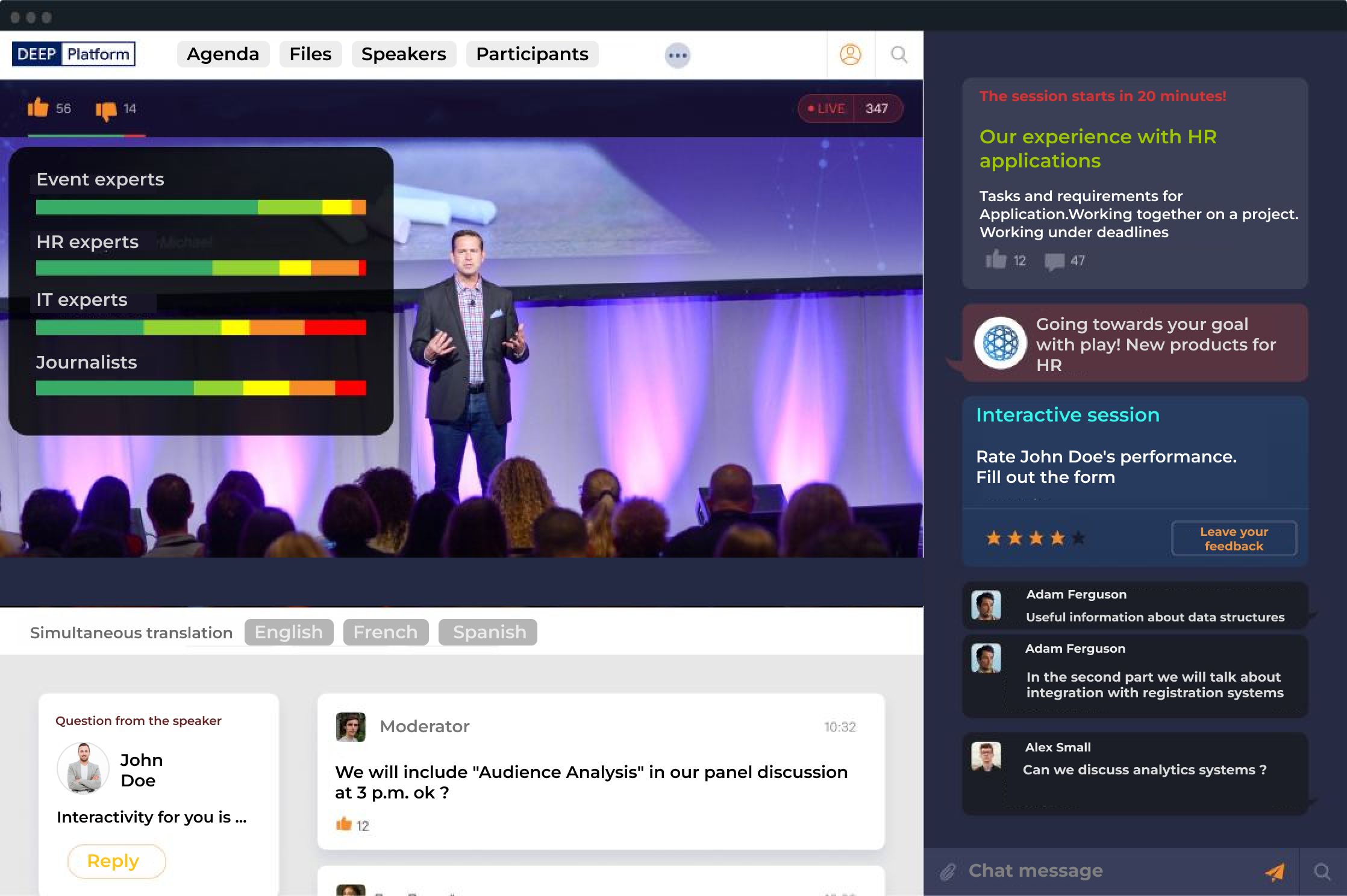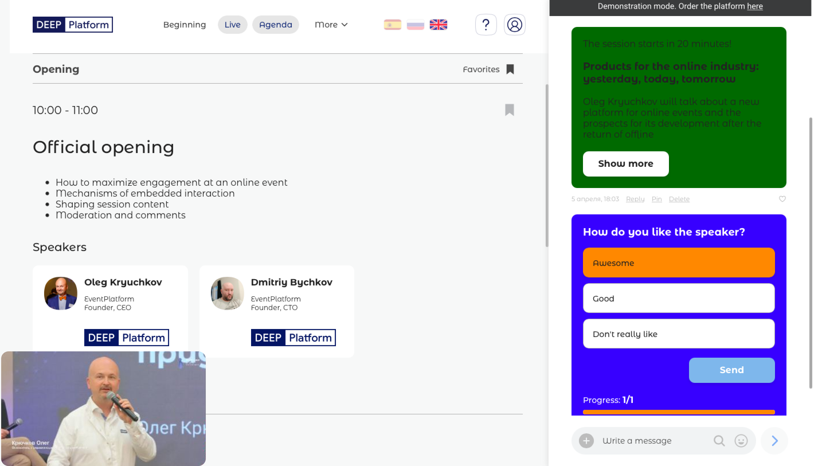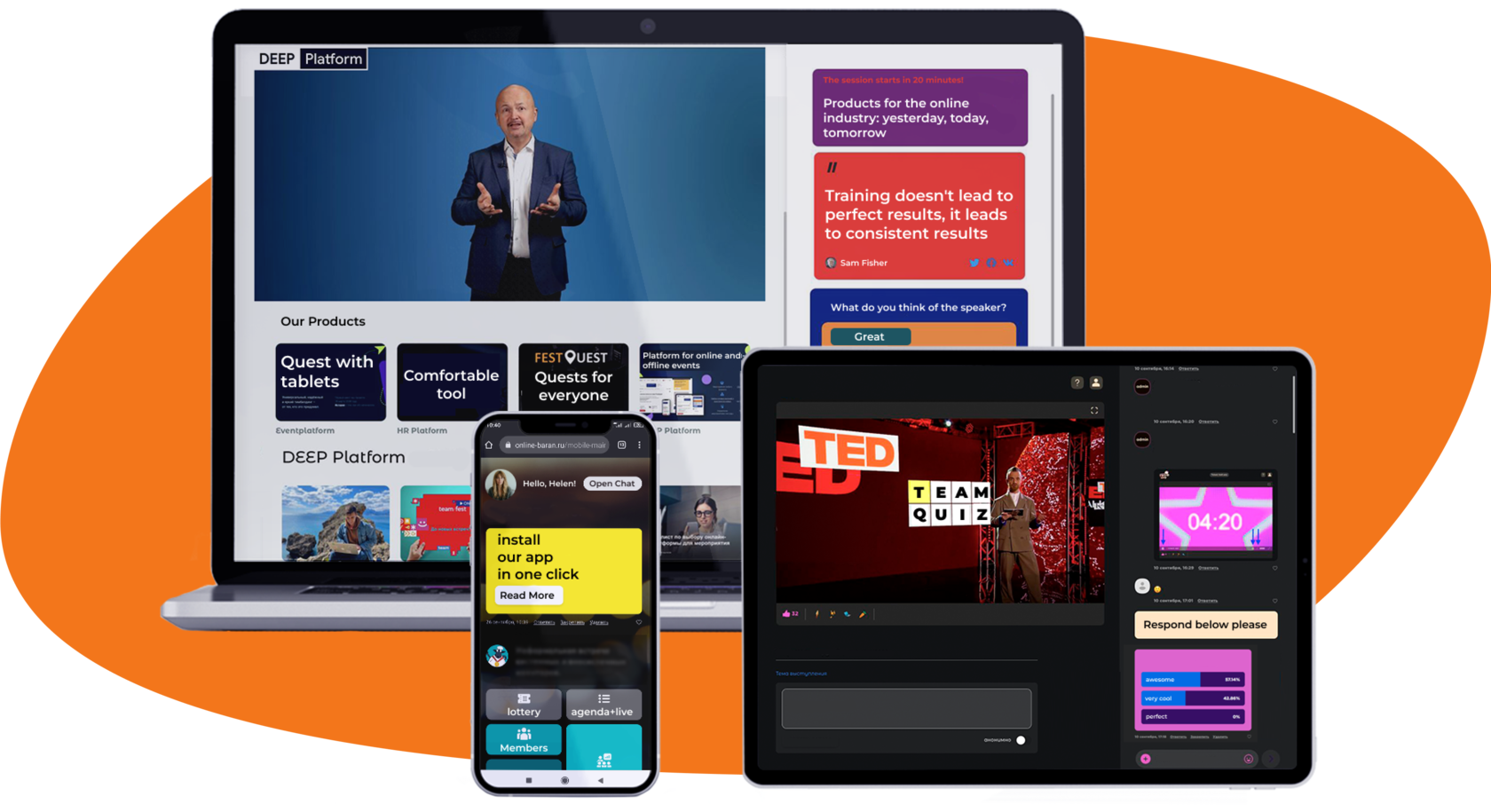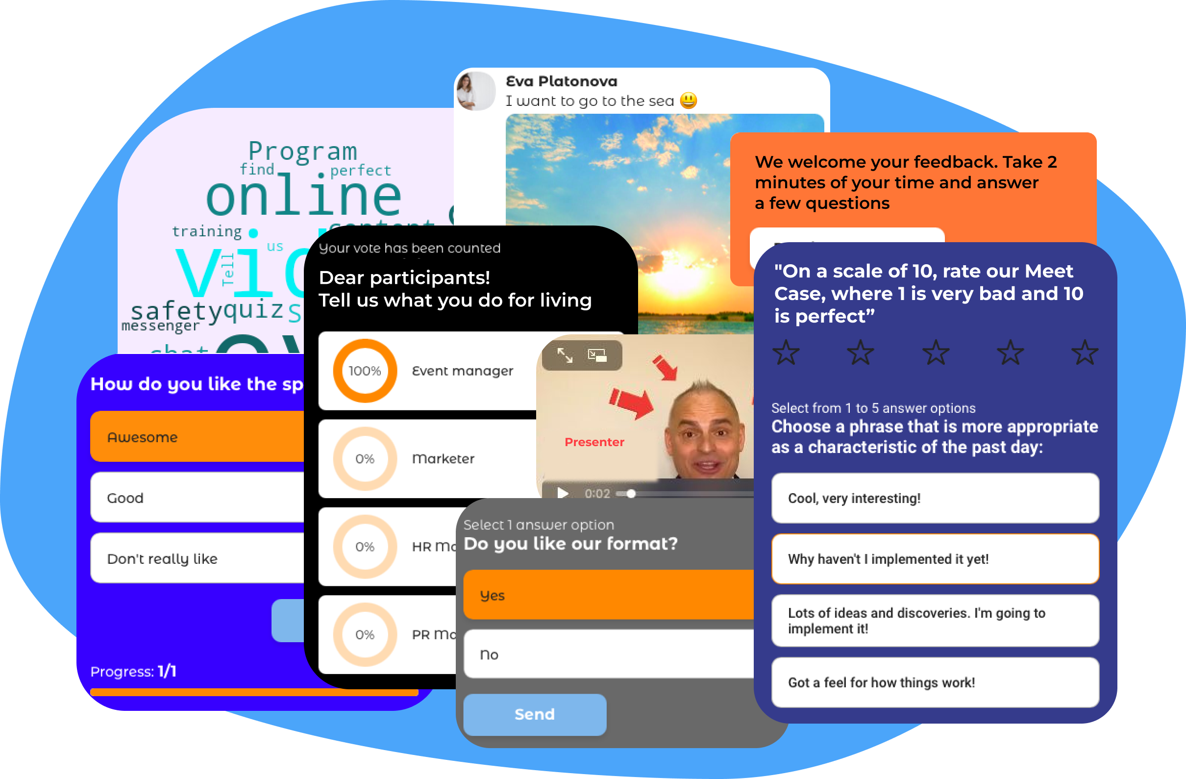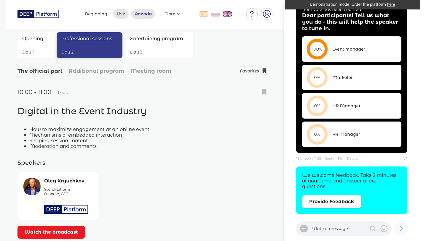 During the event, our team provides operational work in all areas: control and maintenance of broadcasts, publishing content on the platform, moderation of chats, technical support for participants, conducting interactions and team building.